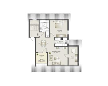 Auf einer Wohnfläche von 57,60 m² verteilen sich ein Schlafzimmer, ein Tageslicht-Bad, sowie ein weiteren Zimmer mit ausschließlich Dachschrägen das sich daher als Büro oder kleines Zimmer anbietet. Der helle Fliesenboden, sowie die vielen Fenster und Dachfenster durchfluten die Wohnung mit viel Licht. Vom Balkon genießt man einen schönen Ausblick über die Umgebung.