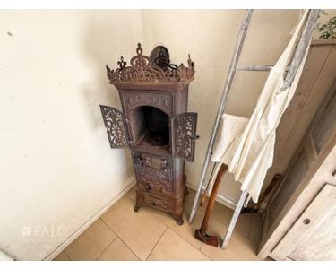 Besonderes Highlight ist die offene Wohnküche, ausgestattet mit einer Küchenzeile und einem stilvollen, historischen Ofen – ein echtes Schmuckstück, das nicht nur optisch begeistert, sondern auch schnell und verlässlich den Raum beheizt.