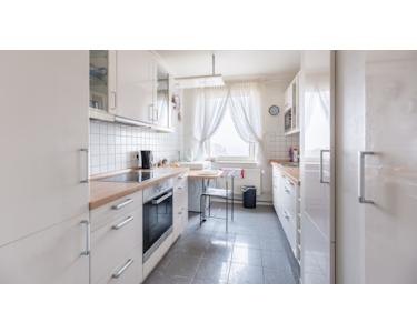 Im hellen Dekor präsentiert sich die funktionelle Einbauküche, die mit ausreichend Ober- und Unterschränken und den notwendigen Elektrogeräten ausgestattet ist. Platz für eine kleine Frühstücksecke ist hier ebenfalls noch vorhanden.