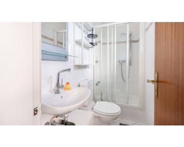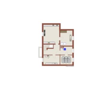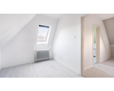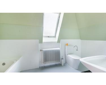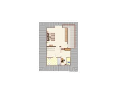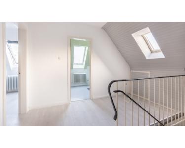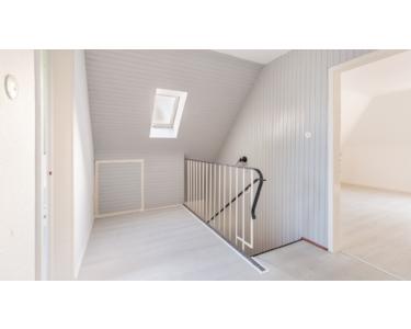 Über die Holztreppe erreichen Sie das Obergeschoss, wo sich das große und gut geschnittene Schlafzimmer mit Abseite sowie ein kleineres Kinderzimmer und das Badezimmer befinden. Das Badezimmer besitzt weiße Sanitärelemente (Badewanne, Handwaschbecken und WC) sowie ein Veluxfenster-Fenster.