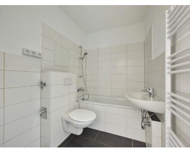 - modern gefliestes Wannenbad mit praktischen Handtuchheizkörper & Waschmaschinenanschluss