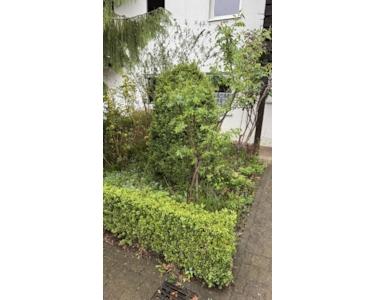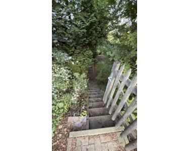 Vor dem Haus befindet sich ein Autostellplatz. Getrennt durch die ruhige Anliegerstraße gehört ein rd. 344 m² großer Naturgarten mit Geräteschuppen und kleiner Terasse dazu.