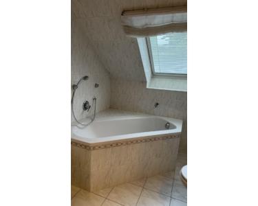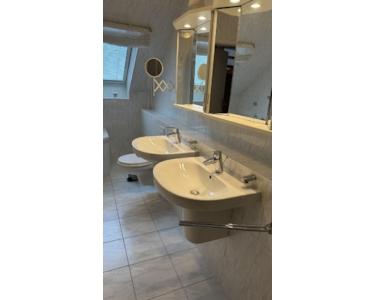 Großzügiges Tageslichtbad: komfortable Eckbadewanne und Dusche, Doppel-waschtische, helle, zeitlose Fliesen