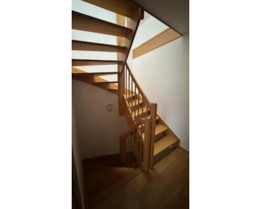 Die offene Holztreppe verbindet die Etagen elegant und schafft ein warmes Wohngefühl.