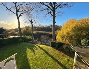 Der eingeschossige Anbau aus dem Jahr 1983 erweitert das Raumangebot mit einer zusätzlichen Wohneinheit im Erdgeschoss. Hier finden Sie ein stilvolles Schlafzimmer, einen kombinierten Wohn- und Essbereich, eine Küche und ein Badezimmer. Auch hier gibt es eine Terrasse mit wunderschönem und unverbaubarem Blick über die Ems.