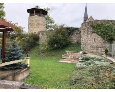 Wunderschöner Garten mit Terrasse und Blick auf historische Stadtmauer.
