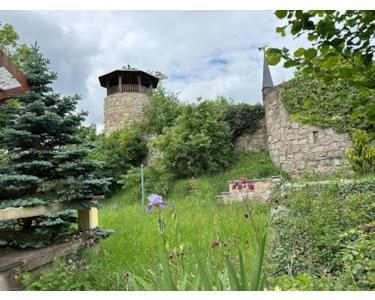 Der schöne Garten ist grün, hat zwei Terrassen und einen wunderbaren Blick auf eine historische Stadtmauer. Ideal für Familien mit Kindern.
