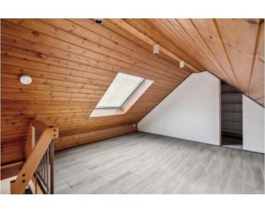 Im Dachgeschoss sind Küche und Spitzboden mit Vinyl ausgelegt. Das Bad hat einen sandfarbigen Vliesenboden. Die Zimmertüren sind Weiß.