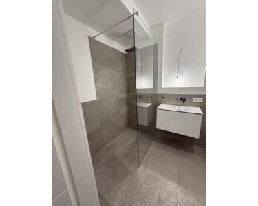 Duschbad mit großformatigen edlen Fliesen und ebenerdiger Ganzglasdusche, edler Geberit Waschtisch mit Unterschrank sowie ein beleuchteter Spiegelschrank (wird noch montiert)