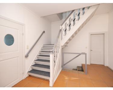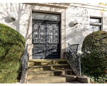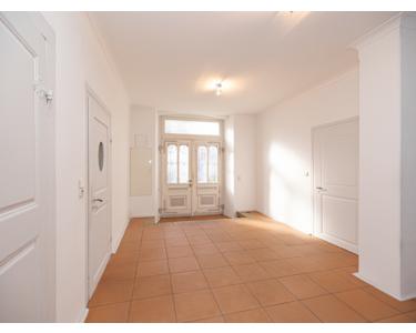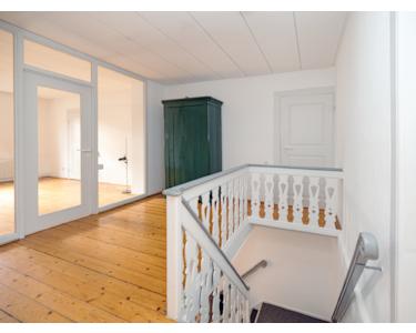 Der linke Gebäudeteil, einst als Notariat genutzt, umfasst rund 197 m² auf zwei Etagen. Eine repräsentative Steintreppe führt in das historische Entrée, während eine kunstvoll verzierte, denkmalgeschützte Holztreppe ins Obergeschoss verbindet. Zusätzlich steht im Dachgeschoss ein großer Archivraum bereit – ideal für Lager, Atelier oder ruhiges Arbeiten.
