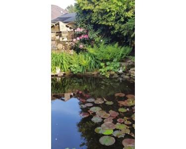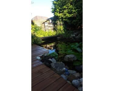 Im Außenbereich ist direkt angeschlossen an die Küche und das Wohnzimmer die Terasse mit Doppelstegplatten. Diese lädt zum sitzen am Teich ein.