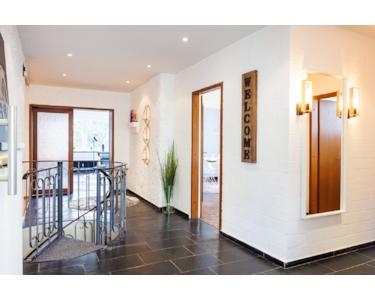 Sie betreten das Haus durch einen Privateingang im Erdgeschoss in einen sehr großzügigen Eingangsbereich, der mit einem exklusiven Bodenbelag aus Naturschiefer ausgestattet wurde. Bis auf ein Zimmer befinden sich alle Räume der Wohnung auf dieser Ebene.
