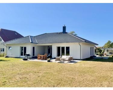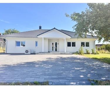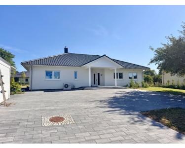 Vor dem Haus gibt es einen großen gepflasterten Bereich, zwei Garagen und einen Carport. Es ist ein repräsentatives Einfamilienhaus, welches sich besonders für die junge Familie eignet oder einfach für Menschen, die Großzügigkeit lieben und alles ebenerdig brauchen.