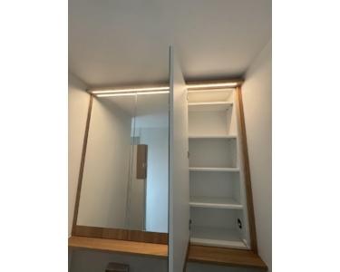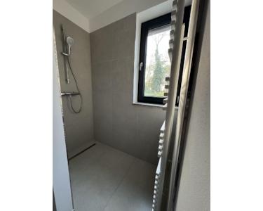 • Badezimmer mit bodengleicher Dusche, großformatigen Fliesen und Markenarmaturen und Einbauschrank