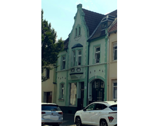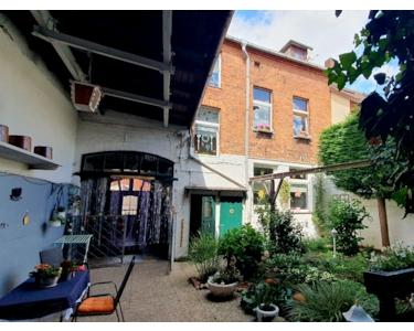 Von der Straße aus gelangt man über eine Einfahrt in den grün gestalteten Innenhof zum Nebengebäude mit einer Garage.