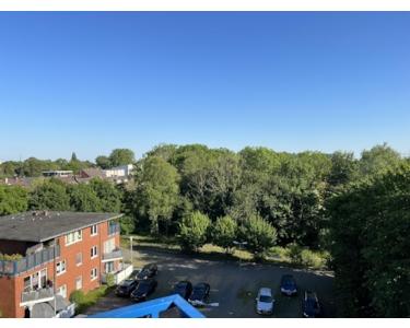 Das kombinierte Wohn- und Schlafzimmer sowie der gemütliche Balkon liegen zur ruhigen Rückseite des Hauses und bieten einen weiten, grünen Ausblick über Bäume und die umliegende Nachbarschaft – ideal zum Entspannen nach Feierabend.