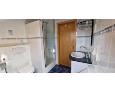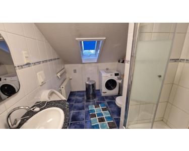 Das kleine aber feine Tageslichtbad verfügt über weiße Wand- und blaue Bodenfliesen und ist mit einer Dusche, WC und Waschbecken sowie einem Waschtrockner ausgestattet.
