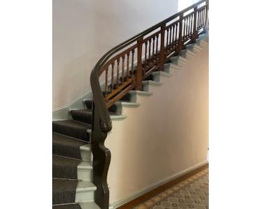 Das Haus stammt vom Anfang des 20. Jahrhunderts. Durch den gepflegten Vorgarten und durch die originale Tür gelangen Sie in den Flur mit Jugendstil-Elementen und atmosphärischer Beleuchtung. Nach einem Abstecher zum Briefkasten führt die geschnitzte Holztreppe zur Wohnung, während Läufer die Schritte dämpfen.