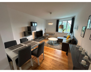 The apartment is fully furnished and offers a new kitchen with Siemens appliances (dishwasher, oven-microwave combination, etc.), a large freestanding fridge-freezer, a coffee maker, dishes, cutlery, and kitchen utensils. The bathroom has a washer-dryer, as well as plenty of storage space throughout the apartment. Additionally, there is a balcony, a Smart TV, an electrically height-adjustable desk and desk chair, a sofa bed in the living room, bedding, towels, a hairdryer, vacuum cleaner, iron, and ironing board.
