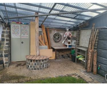 Zum Haus gehört eine Einzelgarage in einer Garagenreihe, die in 15 m Entfernung durch das Gartentor erreichbar ist. Zwei Stellplätze (davon einer mit 22 kW-Wallbox-Anschluss) gehören ebenfalls zum Eigentum. Eine neu angelegte Zuwegung und ein geschützter Garten mit abgesenktem Grillplatz teilen das Grundstück geschickt ein. Die Außenanlagen sind pflegeleicht angelegt und laden dennoch zum Gärtnern (gemauertes Hochbeet) oder Spielen (integrierte Rutsche) ein.