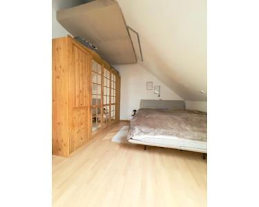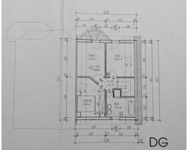 Im Dachgeschoss stehen ein Elternschlafzimmer, mit abgehängter Decke für Stauraum, sowie zwei weitere Zimmer ( aktuell mit Durchgang ) und ein Bad mit Dusche, Badewanne und zwei Einbau-Waschbecken und ein kleiner Dachboden zur Verfügung.