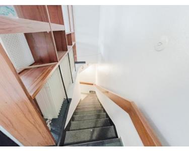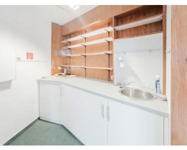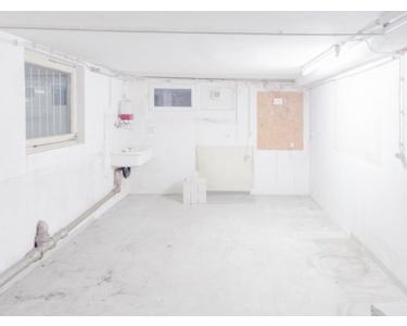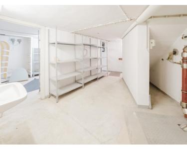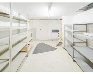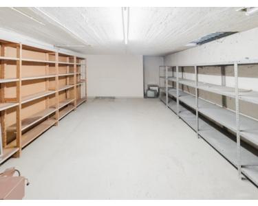 Linker Hand führt der Weg an einer praktischen Küchenzeile vorbei in die Kellerräume. Ein besonderes Highlight ist das großzügige, ca. 87 m² große Lager im Untergeschoss. Es bietet drei separate Räume, teilweise mit Regalsystemen ausgestattet, und eignet sich hervorragend für die strukturierte Aufbewahrung von Waren oder als Lagerraum.