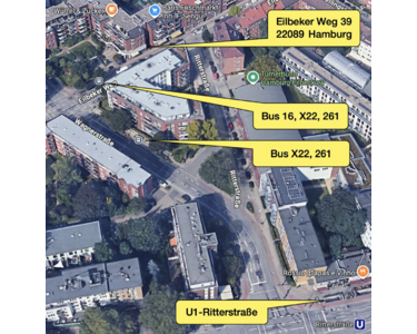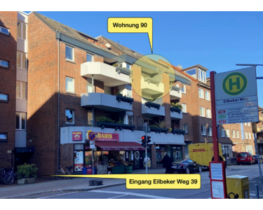 Die Wohnung liegt im beliebten Stadtteil Eilbek, zentral und verkehrsgünstig östlich der Hamburger Alster, 250 Meter zur U1 “Ritterstraße”, 4 Stationen bis zur Hamburger Innenstadt. Der Bus zum Einkaufszentrum Wandsbek–Quarree hält vor der Haustür.