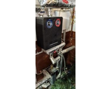 Moderne Gas-Brennwerttherme (2020) mit Solarthermie für Warmwasser und Heizung