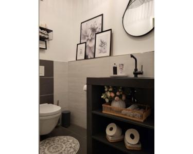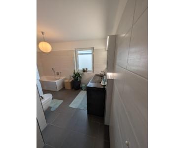 Das Tageslicht-Badezimmer verfügt über eine bodentiefe Dusche und einem großen Lavastein-Waschbecken. Im Gäste-WC ist passend dasselbe Lavastein-Waschbecken verbaut. Im Bad befindet sich ein Waschmaschinenanschluss, welcher insbesondere im Alter seine Vorzüge hat. Sollte der Platz anderweitig benötigt werden - kein Problem, da es im Haus einen separater Waschraum gibt. Hier ist ein verschließbarer Waschanschluss der Wohnung zugehörig.
