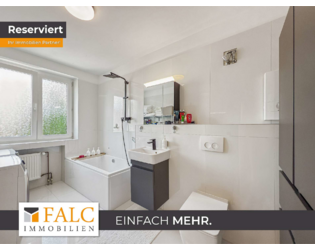 Das Badezimmer wurde komplett erneuert und besticht durch eine strahlend moderne Ausstattung. Hochwertige Fliesen, stilvolle schwarze Armaturen und eine komfortable Duschbadewanne sorgen für ein elegantes Ambiente. Ein Waschmaschinenanschluss ist hier selbstverständlich integriert.