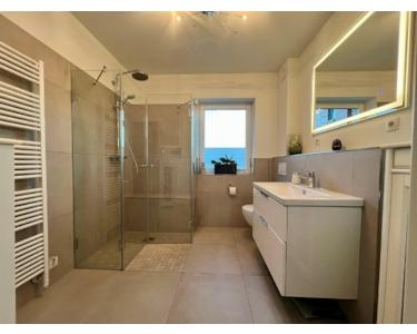 - Großzügige bodengleiche Dusche mit beheizter Sitzbank