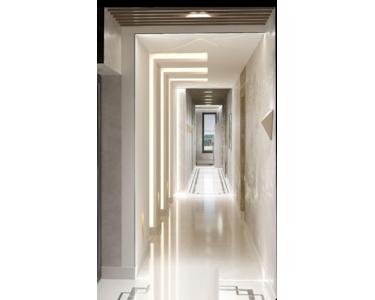 Durch einen langen und geschmackvoll designten Flurbereich gelangt man zum Wellnessbereich, wo man den Tag nach getaner Arbeit ausklingen lassen oder auch an den Wochenenden einfach nur entspannen kann.