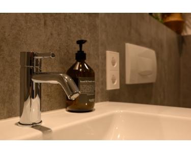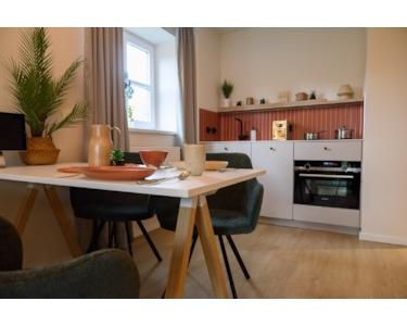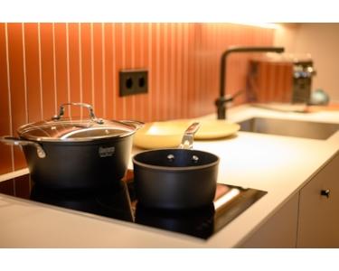 Die moderne Einbauküche ist hochwertig ausgestattet und fügt sich perfekt in das stilvolle Ambiente des Apartments ein – ideal zum entspannten Kochen oder für den schnellen Espresso am Morgen.