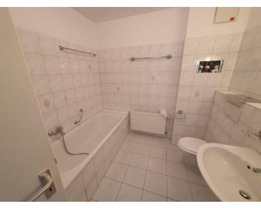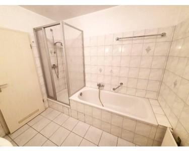 Badezimmer: Badewanne, Dusche, weiße Wand- und Bodenfliesen