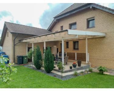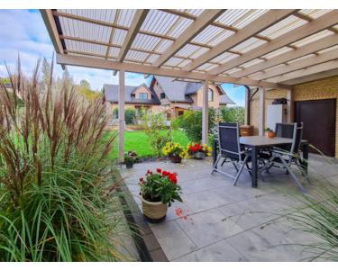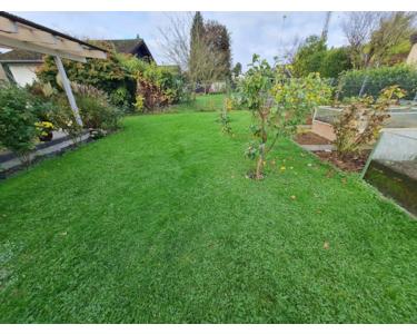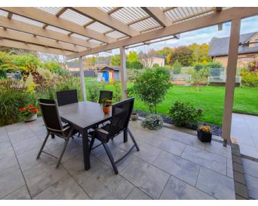 Das Grundstück von ca. 695 m² ist eingezäunt und pflegeleicht angelegt. Im hinteren Gartenbereich befindet sich ein Gartenhaus und dort ist auch ein Nutzgarten, teils auch mit Sträuchern angelegt. Zudem lädt eine große, überdachte Terrasse zum gemütlichen Verweilen ein.