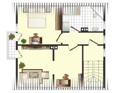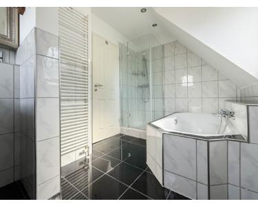 Im Dachgeschoss befinden sich aktuell zwei Schlafzimmer mit Zugang zum Balkon sowie ein modernes Bad mit Wanne und Dusche.