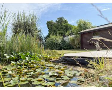 Der liebevoll angelegte Garten mit Terrasse und Teich lädt im Sommer zum Verweilen ein. Eine elektrische Markise sorgt für angenehmen Schatten und ein Gartenhaus bietet zusätzlichen Stauraum für Ihre Gartenutensilien.