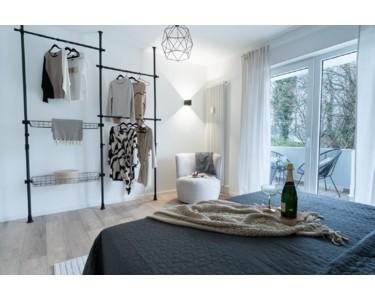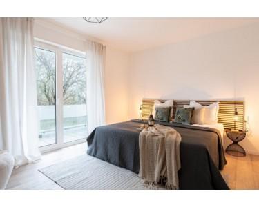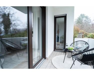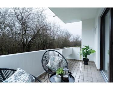 Der Wohnbereich führt Sie auf den überraschend großen Balkon. Hier ist genug Platz für eine gemütliche Lounge-Ecke, um den Feierabend zu genießen.