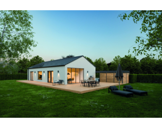 Das Bungalow Aktionshaus bietet eine außergewöhnlich kluge und moderne Grundrissgestaltung, die begeistert. Optional ist dieser Entwurf auf Anfrage mit einer 4-teiligen rahmenlosen Schiebetüranlage verfügbar.