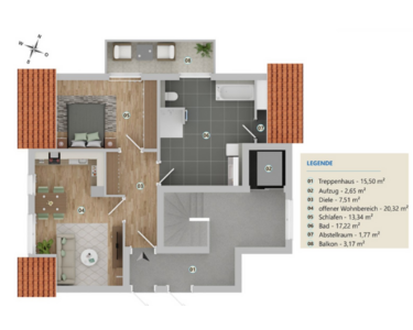 Die Wohnung ist mit 3-fach verglasten Kunststofffenstern und elektrischen Rollläden ausgestattet. In den Wohnräumen befindet sich eine Fußbodenheizung mit Einzelraumsteuerung. Als Bodenbeläge sind Parkett, Laminat oder Vinyl vorgesehen, in Bad und WC Fliesen. Die Bauweise entspricht dem KfW-40-Standard und es kommt eine Luft-Wasser-Wärmepumpe zum Einsatz.