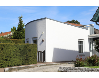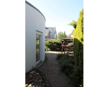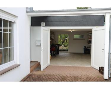 Besonders praktisch ist der barrierefreie Nebeneingang, der das flexible Erreichen des Hauses erleichtert. Der 2022 mit neuer Markise modernisierte Glas-Zwischengang verbindet die Bereiche des Hauses nicht nur funktional, sondern schafft auch ein lichtdurchflutetes architektonisches Highlight.