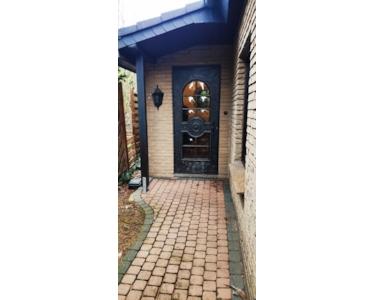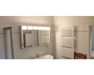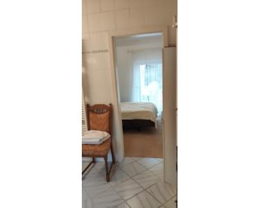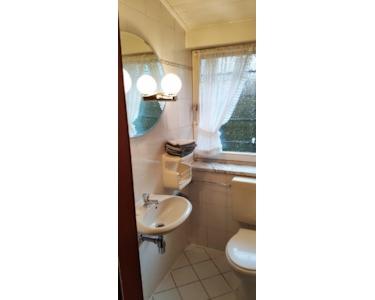 Das Badezimmer verfügt über eine Dusch-Badewanne, ergänzt durch ein separates Gäste-WC. Ein kleines Büro oder Gästezimmer mit direktem Zugang zum Garten eröffnet vielseitige Nutzungsmöglichkeiten – sei es für Homeoffice oder Besucher. Abgerundet wird die Ausstattung durch eine Garage mit Zugang von Straße und Garten, ein bis zwei Stellplätze auf der Einfahrt sowie einen kleinen Kellerraum, der über den Innenhof erreichbar ist.