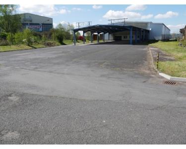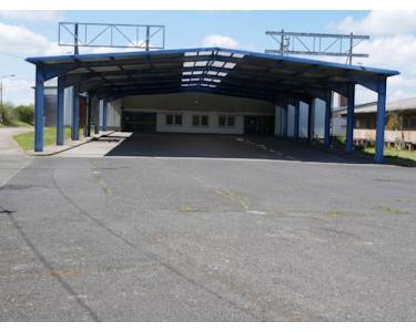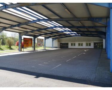 Parkplätze in Front der Halle sind überdacht (ca. 600qm) hier gibt es jeweils einen Ein- und Ausgang über eine Doppelte Schiebetür.