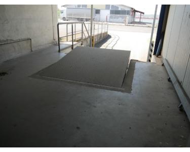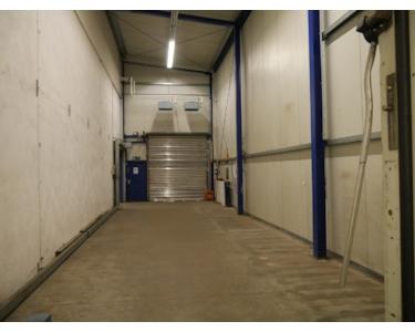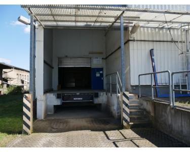 Auf der Rückseite befindet sich eine LKW Laderampe mit separaten Raum zum abstellen der Ware. Ebenfalls auf der Rückseite ist ein großes Rolltor zum befahren der Halle.