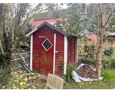 Im Garten befindet sich ein solides Gartenhaus, das auf einem Fundament errichtet wurde. Es eignet sich ideal zur Aufbewahrung von Gartengeräten, Fahrrädern oder anderen Utensilien und schafft so Ordnung auf dem Grundstück.