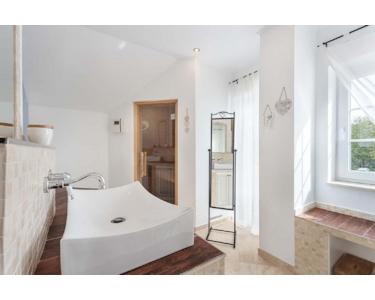 - Luxuriöses Masterbad (freistehende Wanne, Sauna, Travertin, große Dusche)
