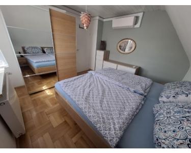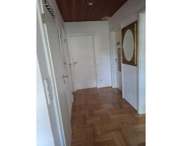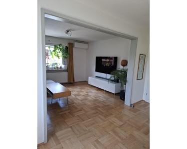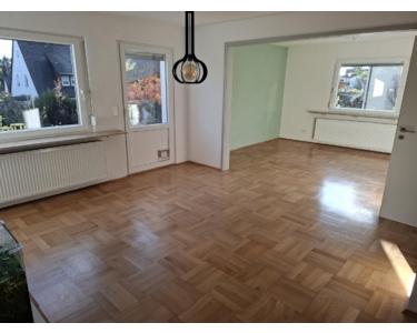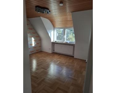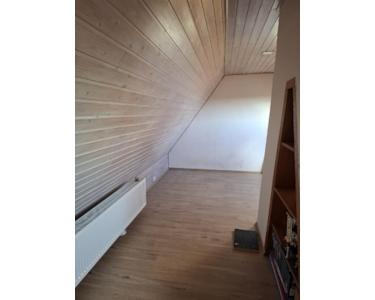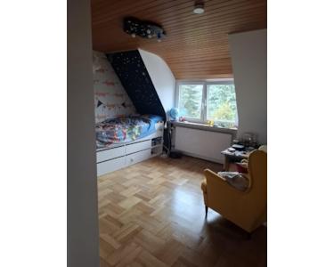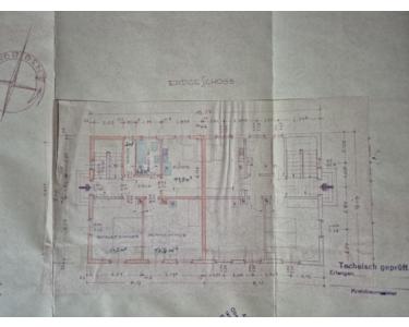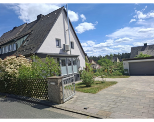 Doppelhaushälfte aus den 1950er-Jahren, die seit 2017 fortlaufend modernisiert wurde. Im EG befinden sich die Küche, das Duschbad, eine Abstellkammer sowie das große Ess-/Wohnzimmer mit Ausgang zur Terrasse. Im OG befinden sich die drei Zimmer, ein weiteres (kleineres) Bad mit Wanne sowie eine weitere Abstellkammer. Im DG befindet sich ein in den 1980er-Jahren ausgebautes Zimmer, das mittels Luke verschlossen werden kann. Hier befindet sich in der Mitte ein stillgelegter Kamin, der bei Bedarf entfernt werden kann, um mehr Platz zu schaffen.