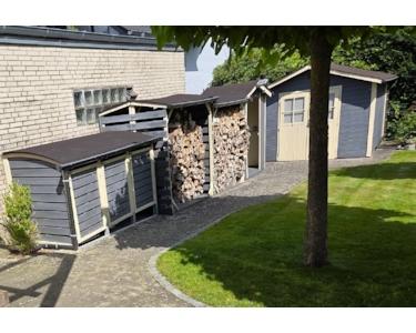 Neugestaltung des Grundstücks/Garten, Bodenaustausch, Pflaster, Pflanzen, Rasen, Beete, Gartenstrahler & Erdkabel usw., neues Gartenhaus, Kaminholzregal, Abfallboxen
