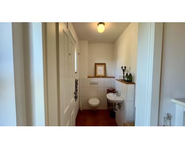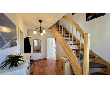 Eine Buchenholztreppe führt in das Obergeschoss. Das Haus besitzt einen Glasfaseranschluss, so können Sie u. a. im kleinen Büro im Erdgeschoss Ihr Homeoffice einrichten. Im Hauswirtschaftsraum befinden sich die Heiztechnik (Luft-Wasser-Wärmepumpe), der Stromverteilerschrank und die Anschlüsse für Waschmaschine und Trockner. Alle Innentüren sind im Landhausstil, in weißer Farbe gehalten. Das Gäste-WC ist geräumig und die Ablagen sind aus Massivholz.
