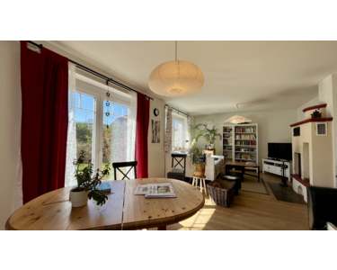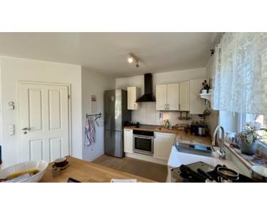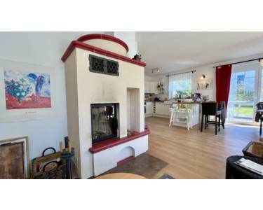 Die offene Wohn-/Esszimmer/Küche liegt südwestlich und fängt über die bodentiefen Sprossenfenster viel Tageslicht ein. Ein Hingucker ist der gemauerte Kamin, der an kalten Tagen für behagliche Wärme sorgt. Im Kaufpreis enthalten ist die eingefasste Küche mit Elektrogeräten und einem komfortablen Steh- und Esstresen.